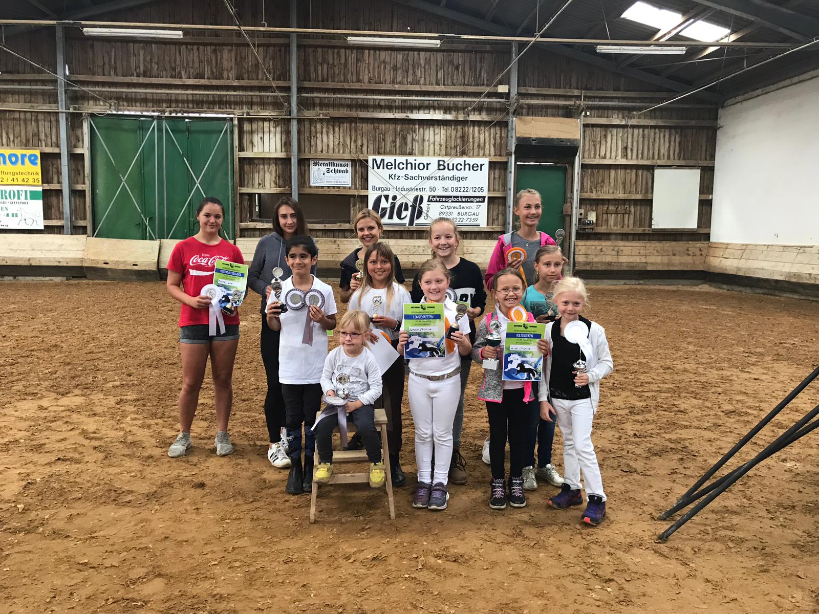 Geschäftiges Treiben und große Anspannung herrschten am Samstag, den 12.11.2016, auf der Reitanlage in Offingen. Grund dafür war das alljährliche vereinsinterne Turnier, bei dem die Kleinsten, aber auch die Fortgeschrittenen ihr Können unter Beweis stellen konnten. Geprüft wurden die insgesamt 55 Teilnehmer unter den strengen Augen von zwei Prüferinnen in den Disziplinen „Voltigieren“, „Longenreiten“, „Reiterwettbewerb“ und „E-Dressur“. Die Siegerehrung fand in gebührendem Rahmen am nächsten Morgen in der Reithalle des Vereins statt. Die Sieger und Platzierten dieses Tages sind im Einzelnen: