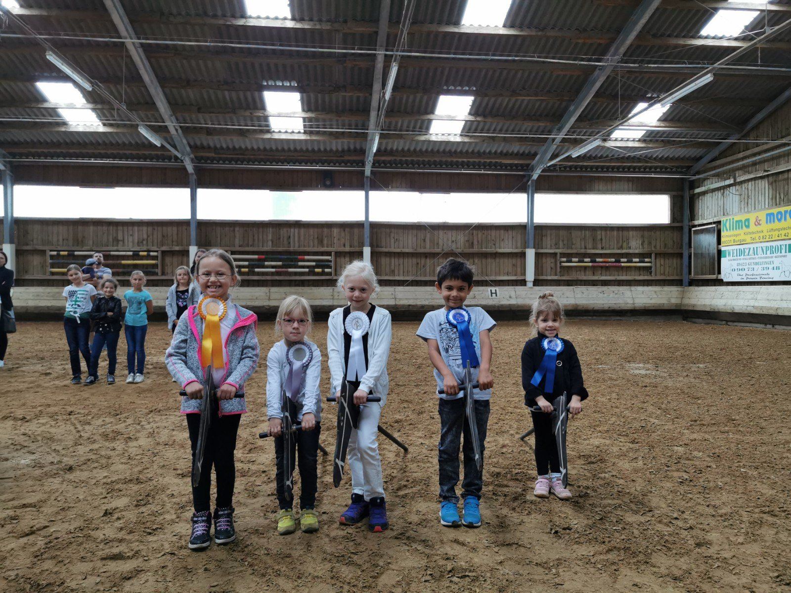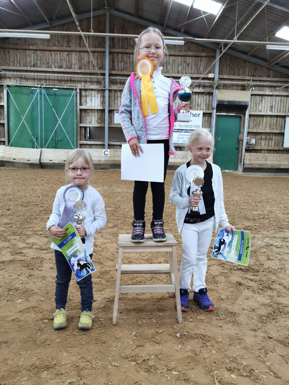 Unter 54 Teilnehmern im Alter von vier bis 33 Jahren wurden beim jährlichen vereinsinternen Turnier am 30.6. und 1.7. die Besten ermittelt. Die Jüngsten konnten sich über Pokale, Schleifen und Urkunden im „Voltigieren“ freuen, wofür sie zuvor Figuren auf dem stehenden Pferd zeigen und ihre Haltung in allen drei Grundgangarten unter Beweis stellen mussten. Ebenfalls Gegenstand der Bewertung ist die Haltung der Reiter im Schritt, Trab und Galopp beim „Longenreiten“. Die acht Teilnehmerinnen dieser Disziplin erhielten Schleifen und Urkunden, wobei die besten drei nun zusätzlich den Titel „Vereinsmeister“ tragen dürfen. Für diejenigen, die bereits ohne fremde Hilfe sattelfest in Schritt und Trab sind, gab es im „Reiterwettbewerb Pony“ neben Pokalen, Schleifen und Urkunden ebenfalls den Titel des Vereinsmeisters zu holen. Über ein T-Shirt mit Vereinslogo können sich die Sieger des „Reiterwettbewerbs“ freuen, die dafür allerdings auch im Galopp überzeugen mussten. Für die fortgeschrittenen Reiter stellte die Aufgabe E3, die es möglichst korrekt zu absolvieren galt, eine Herausforderung dar, der sich sieben Teilnehmerinnen stellten.